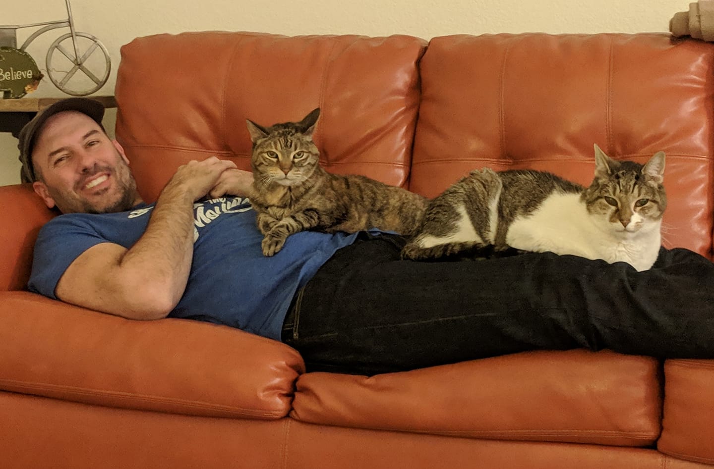 Growing up, I never imagined just how deeply cats could change my life. I didn’t have pets as a kid, and for a good part of my early adult life. Then, only July 5th, 2003, I went to a mall in Dallas, Texas where I was living at the time. I went to go buy some clothes with my sister Jill, who was visiting from out of town. While we were there, we noticed the SPCA had set up an adoption booth, so I said to Jill, “let’s go look at the kittens.” I never expected I would leave the mall with 2 kittens, and no clothes. OK, that probably doesn’t read right. I came home without having purchased any new clothes. I, of course, was still wearing clothes. 😂